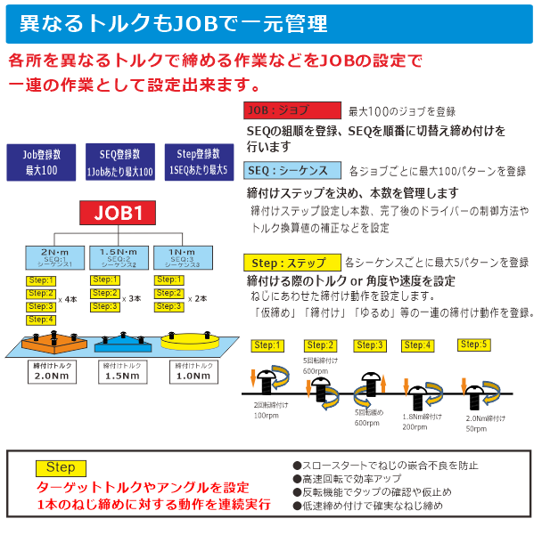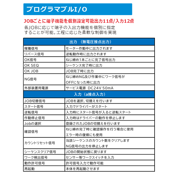 ●トルク/回転角度等の可変は「バーコード」「専用ソフト」「IO入力」で自由に切替可能